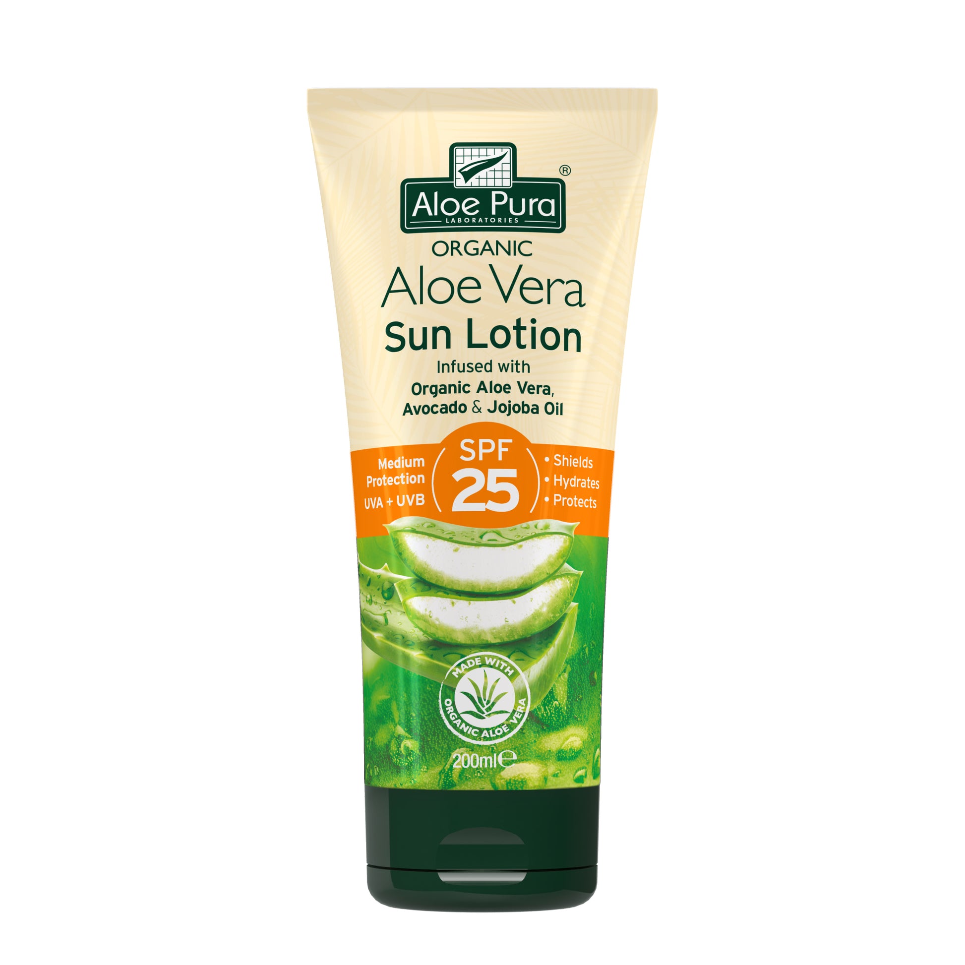 AloePura Aloe Vera Sun Protection Lotion SPF25 is produced with pure (unfiltered) organic aloe vera inner (fillet) gel, capturing the maximum nutritional activity of the Aloe barbadensis plant. They enrich their sun protection lotion SPF25 with nourishing jojoba oil, avacado oil and chamomile extract to provide up to 25 times your body's natural protection against the sun's rays. SPF25 UVA/UVB protection is considered "medium" protection.