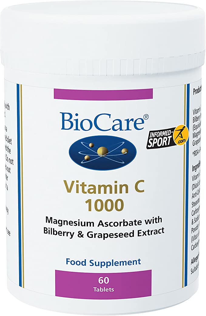 Vitamin C 1000 provides 1000mg of magnesium ascorbate (a low-acid buffered form of vitamin C to reduce stomach irritation) together with synergistic antioxidants in the form of bioflavonoids bilberry and grapeseed extract.