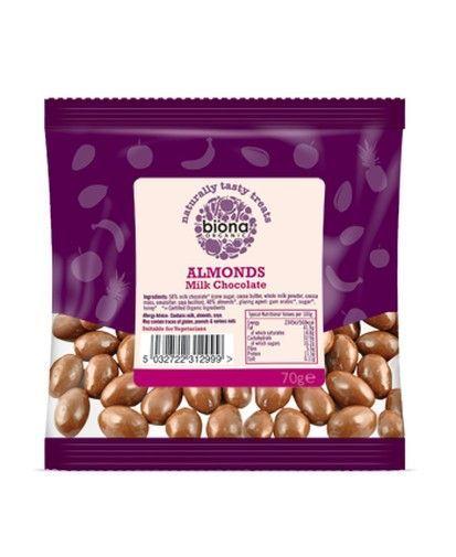 58% milk chocolate* (cane sugar, cocoa butter, whole milk powder, cocoa mass, emulsifier: soya lecithin), 40% almonds*, glazing agent: gum Arabic*, sugar*, honey* *= certified organic ingredients.