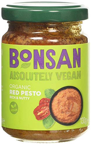 Bonsan Vegan Organic Red Pesto is made without dairy. It is a rich and sweet blend of sundried tomatoes and cashew nuts. This tasty pesto is perfect stirred into pasta, drizzled over grilled vegetables or spread in sandwiches! Also available as a green pesto.