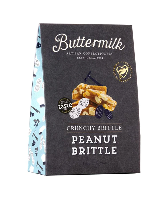 Award-winning flavour that's hand-broken and enticingly sweet, with whole roasted peanuts wrapped in a buttery brittle for a satisfying, toffee crunch. Dive into a delightful blend of textures and tastes with the Buttermilk Peanut Brittle Fudge Sharing Box 150g! This charming little box holds a sweet surprise.