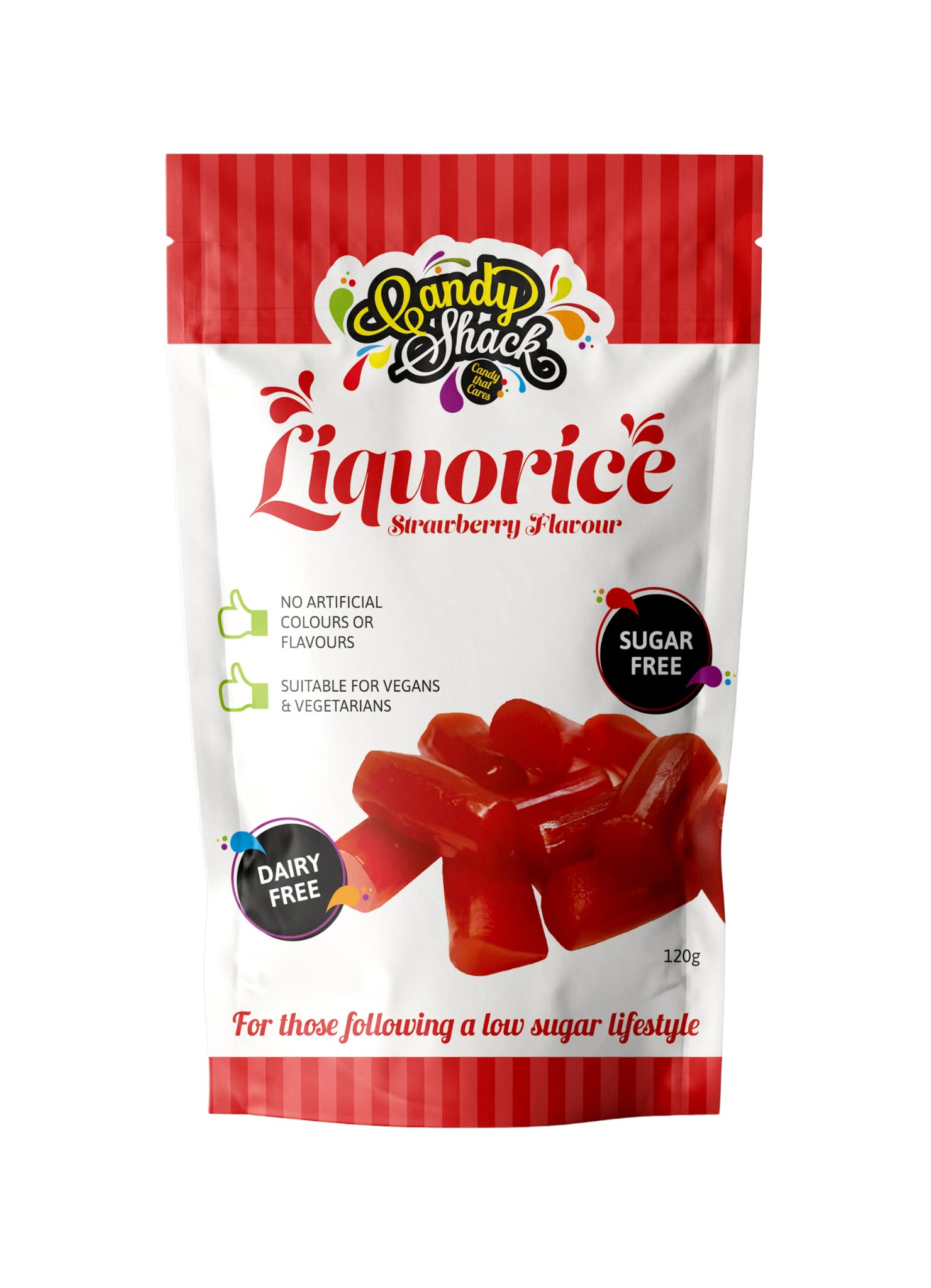 Candyshack Sugar Free Strawberry Liquorice 120g Candyshack home of the fabulous tasting sugar free confectionery. They believe sweetness is meant to be enjoyed that's why their range of traditional soft eating Liquorice has been created, allowing you to reduce sugar but not the flavour. This traditional liquorice has been crafted to give a soft bite so all liquorice lovers can enjoy. Suitable for vegans and vegetarians. Free from Nuts, Dairy and Sugar.