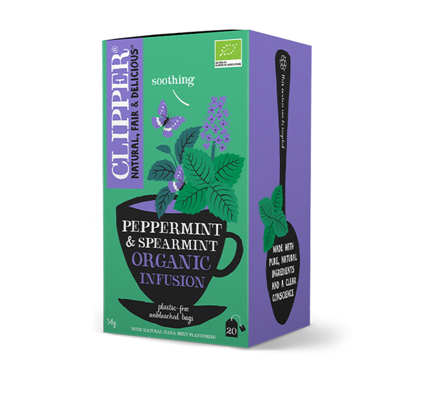Clipper Organic Peppermint & Spearmint Infusion is a refreshing and revitalizing blend of two organic mints specially crafted to provide a cool crisp taste and soothing sensation with every sip. Known for their digestive benefits and naturally caffeine-free properties peppermint and spearmint create a clean invigorating infusion that’s perfect for enjoying both hot and iced.