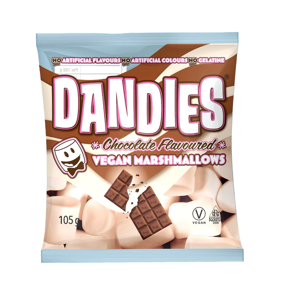 Dandies chocolate flavoured marshmallows are simply delicious. Hints of chocolate flavour in soft mallow goodness. Made with no artificial flavours or colours, no gelatine and are gluten free. They are also non-GMO verified and Kosher. Not only that, they also taste delicious.