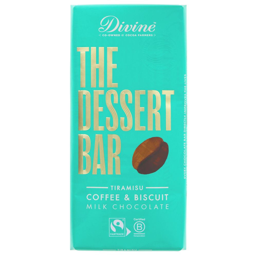Enjoy a new Dessert Experience! Crunchy coffee pieces, soft buttery biscuits and baked waffle pieces all encased in smooth milk chocolate. The essence of a Tiramisu in a chocolate bar. Divine only uses 100% Fairtrade cocoa and sugar, natural flavours and no palm oil or soya. As the only Fairtrade chocolate company in the world co-owned by farmers, they are proud to say that every bar you buy improves the lives of cocoa farmers and their families.