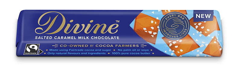 Divine Salted Caramel Chocolate Bar 35g is a smooth milk chocolate bar with a kick of salted caramel. It is made with Fairtrade cocoa beans grown by Kuapa Kokoo, a cooperative of cocoa farmers in Ghana. The chocolate is also sweetened with Fairtrade sugar from Kasinthula, Malawi and flavored with Fairtrade vanilla from Madagascar.