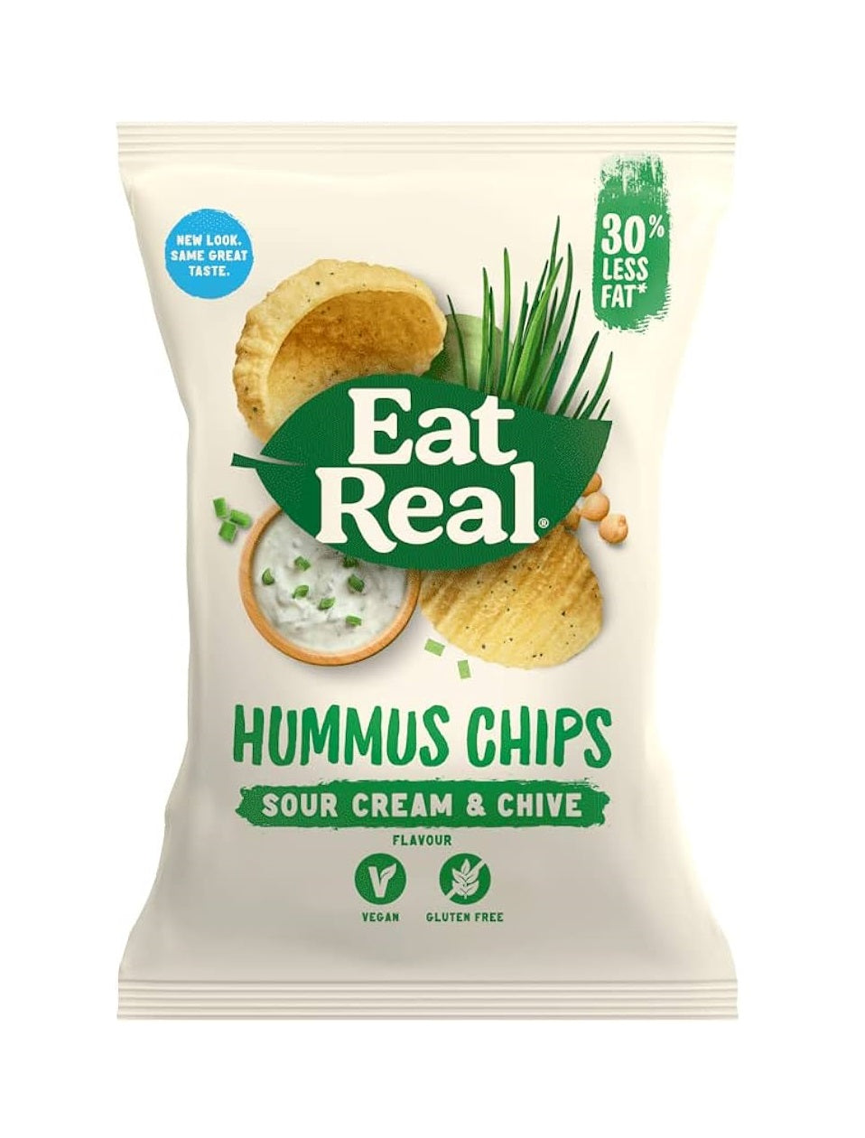 Eat Real Hummus chips- sour cream chives are an alternative and healthier crisp-like Snack made with dill flavour. Ideal for lunchboxes, these Gluten Free chips are as savoury as potato based snacks, but have 48 percent less fat. Chips contain a unique blend of ingredients including chick peas that are infused with dill to create a cool refreshing taste in your mouth. It is free from artificial, flavours, colours and preservatives.