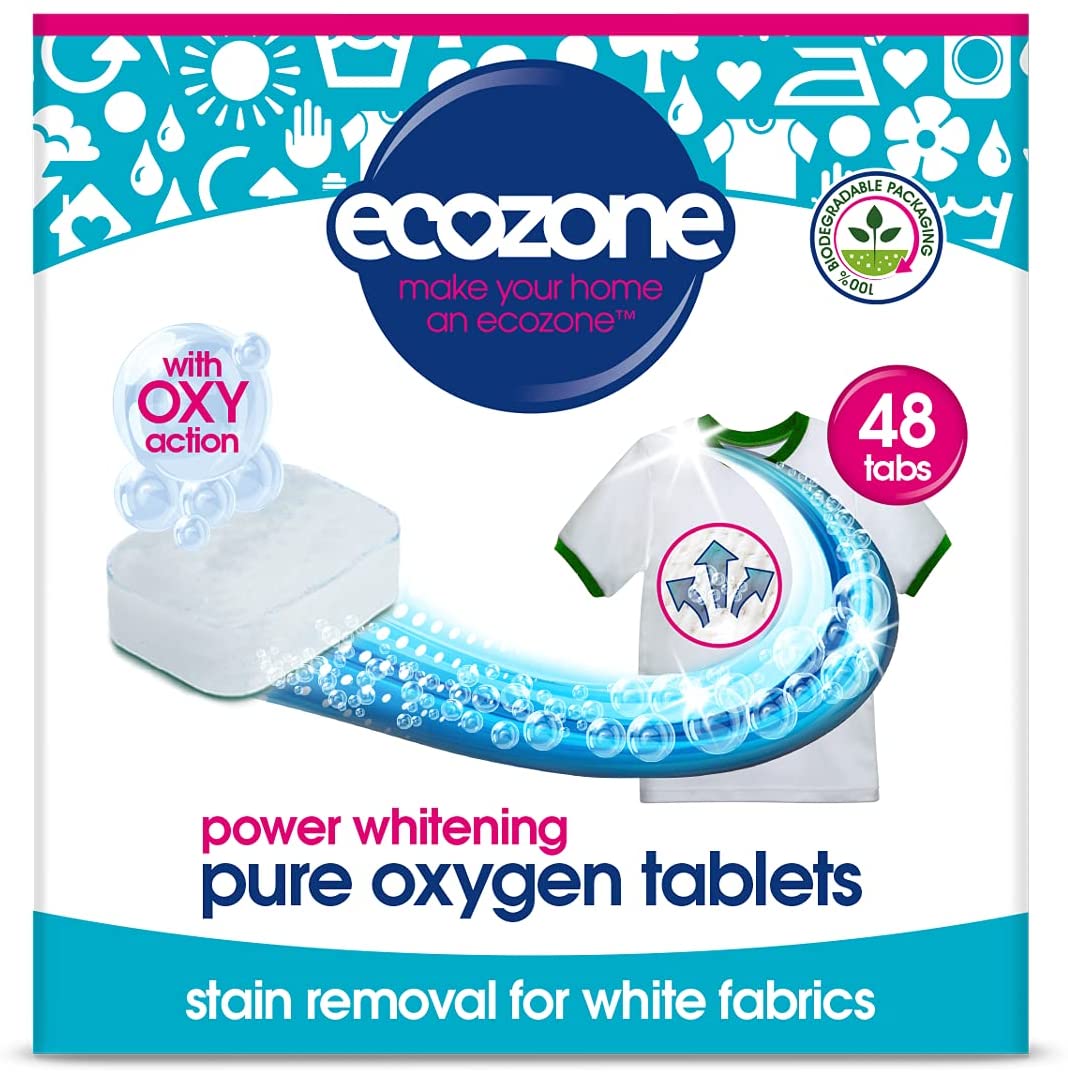 Ecozone’s Pure Oxygen Laundry Whitening 48 Tablets are designed to bring your whites back to life by removing stains and grime. Easy to use, simply add one tablet to every wash with your usual detergent and fabric conditioner. Ecozone’s Laundry Whitener Tablets are free from toxic chemicals, harnessing just the power of oxygen and natural ingredients to lift dirt from fabrics.