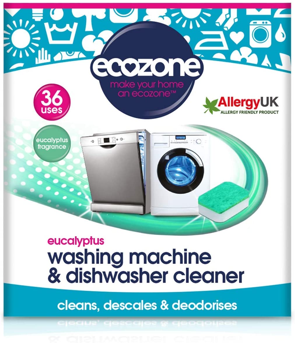 Ecozones Washing Machine & Dishwasher Cleaner tablets help to protect your kitchen appliances. This invigorating eucalyptus formula works to clean, freshen and descale, by getting rid of stubborn limescale and detergent that has built up over time. With using this easy to use solution, your machine can keep performing at its best and you can avoid expensive call out charges and repair bills. With a fresh lemon scent, our eco-friendly formula will leave your appliances free of any nasty odours. Simply use one tablet every month to keep your appliances in tip-top shape. Now available in Fragrance-Free, Eucalyptus and Mint Fragrances. Pack sizes available in 6 or 36 tablets. For washing machines: 1) Pop a tablet into the drum of your empty machine. 2) Run a hot (60 C plus) cycle without a pre-wash. For dishwashers: 1) Pop a tablet onto the bottom of the empty machine. 2) Run a hot wash without a pre-rinse. There is no need to unwrap the tablet – the packaging is soluble!
