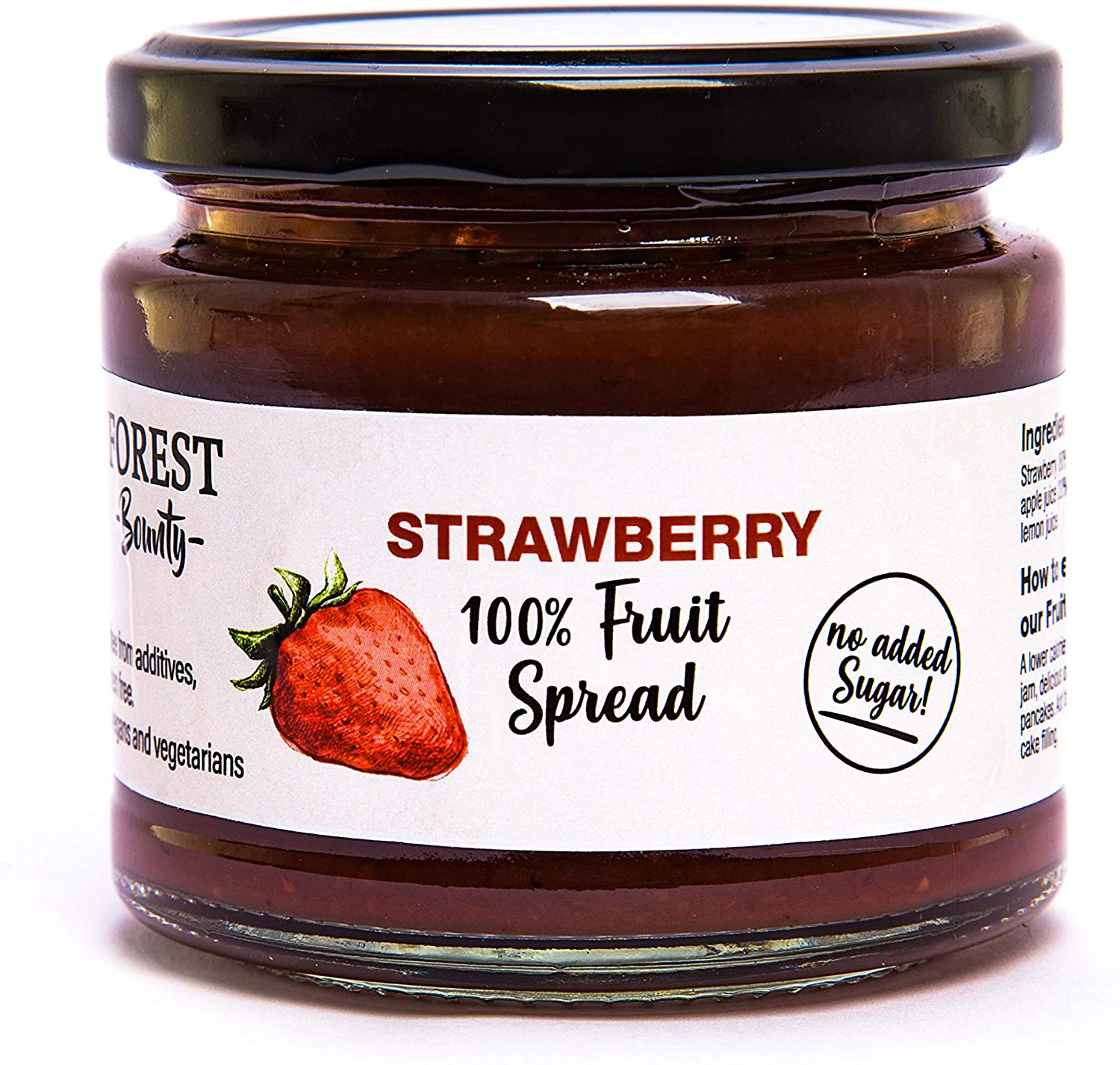 Forest Bounty Strawberry 100% Fruit Spread 250g with no added sugar. Naturally healthy. Used as a spread in place of jam or in cakes, puddings and deserts. Great with yoghurt. Recommended for low sugar diet to improve health.