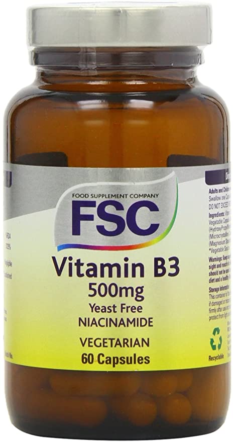 FSC 500 mg niacinamide (vitamin b3) capsules may help support for skin conditions like acne, does not cause skin flushing. A high potency yeast free niacinamide supplement. Suitable for vegans.