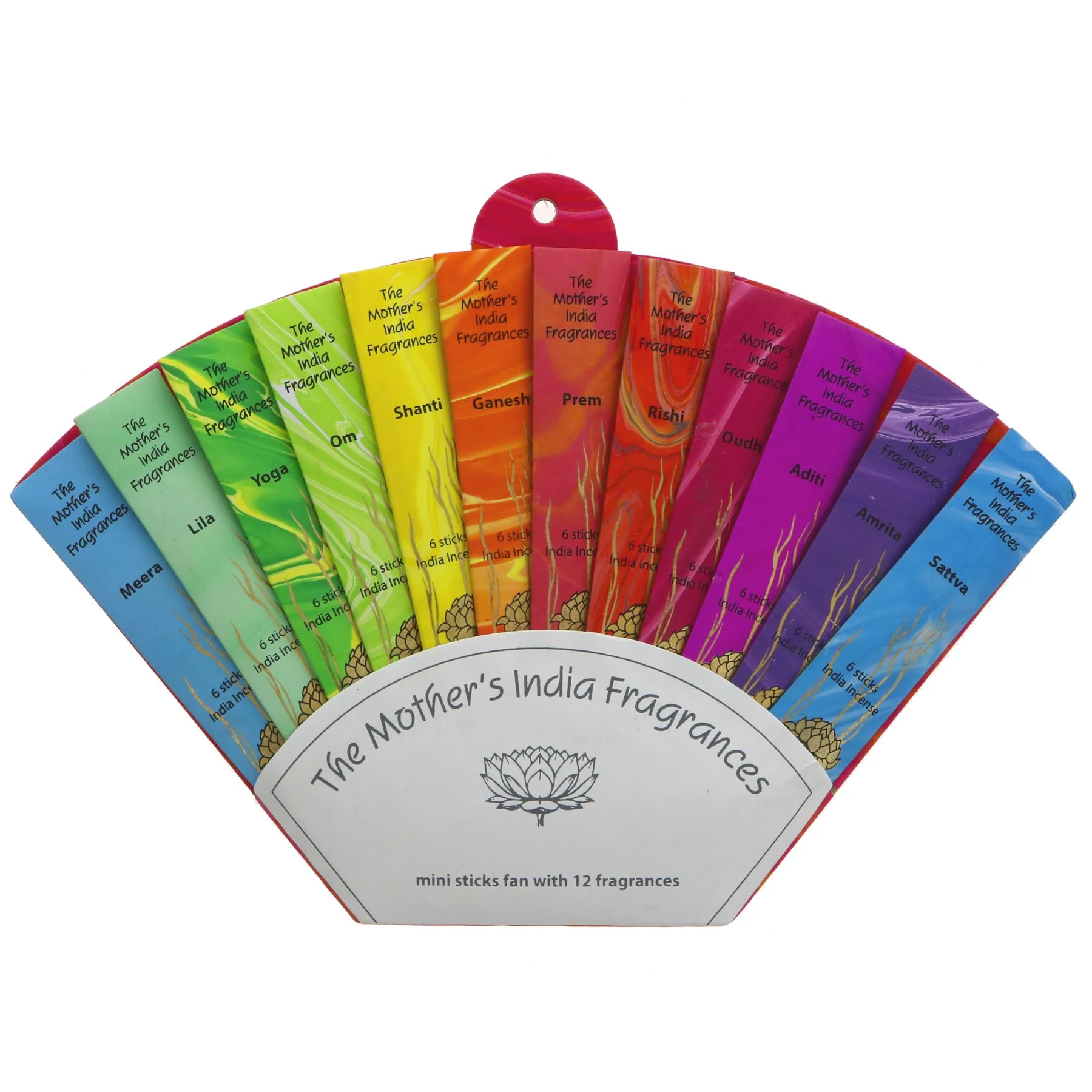 Their bestselling India Fragrances so beautifully turned into a gift set. The fan contains a packets of mini sticks of each of the twelve (standard) Mother's India Fragrances, with 6 ministicks each. Small price, fab smell, they love it! The twelve fragrances in the fan are: amrita, sattva, lila, yoga, om, shanti nag champa, ganesh, prem, rishi oudh, aditi and meera.