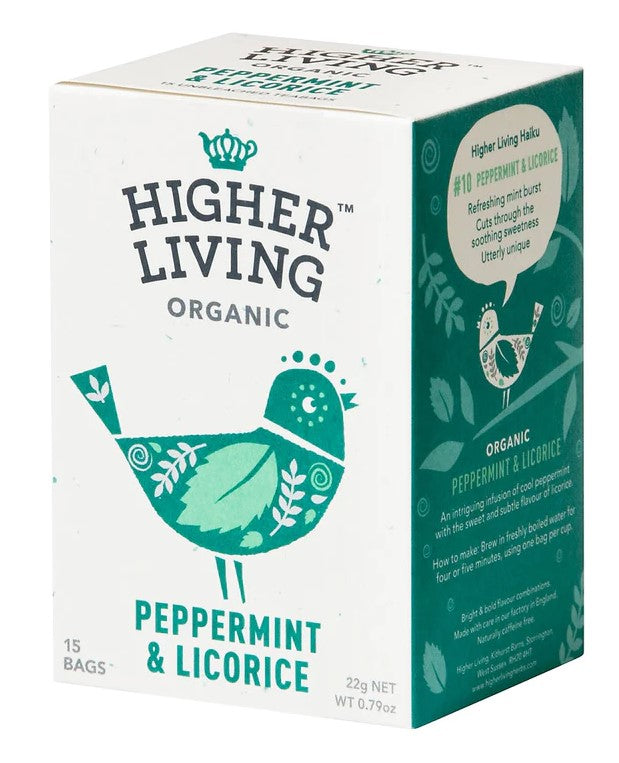 An intriguing infusion of peppermint with the sweet and subtle flavour of licorice. Higher Living have been making great tasting, deliciously refreshing teas for over 45 years, using only the best organic and natural ingredients. Their inspiring infusions have a vibrant taste and an inner strength that's sure to lift your mind, body, and spirit. And because each one is packed with the best, 100% natural, and certified organic herbs, you can be sure you're getting the best out of your cup.