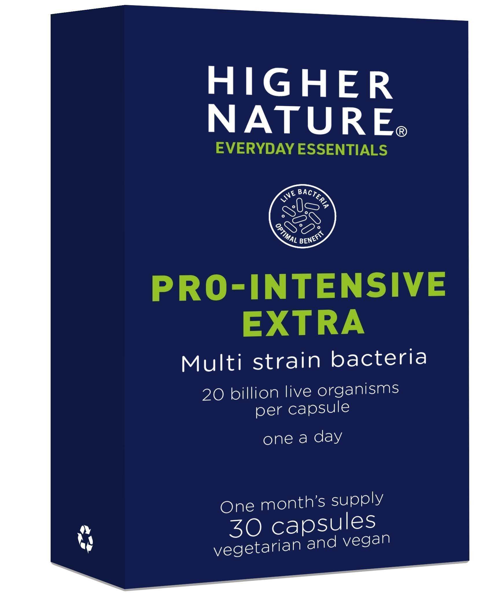 Higher Nature Pro-Intensive Extra Capsules are a comprehensive, advanced multi strain formula featuring Lactobacillus acidophilus, casei and plantarum, alongside Bifidobacterium lactis and bifidum, and Streptococcus thermophilus. Lactobacillus and Bifidobacterium strains contribute to Gut Health.