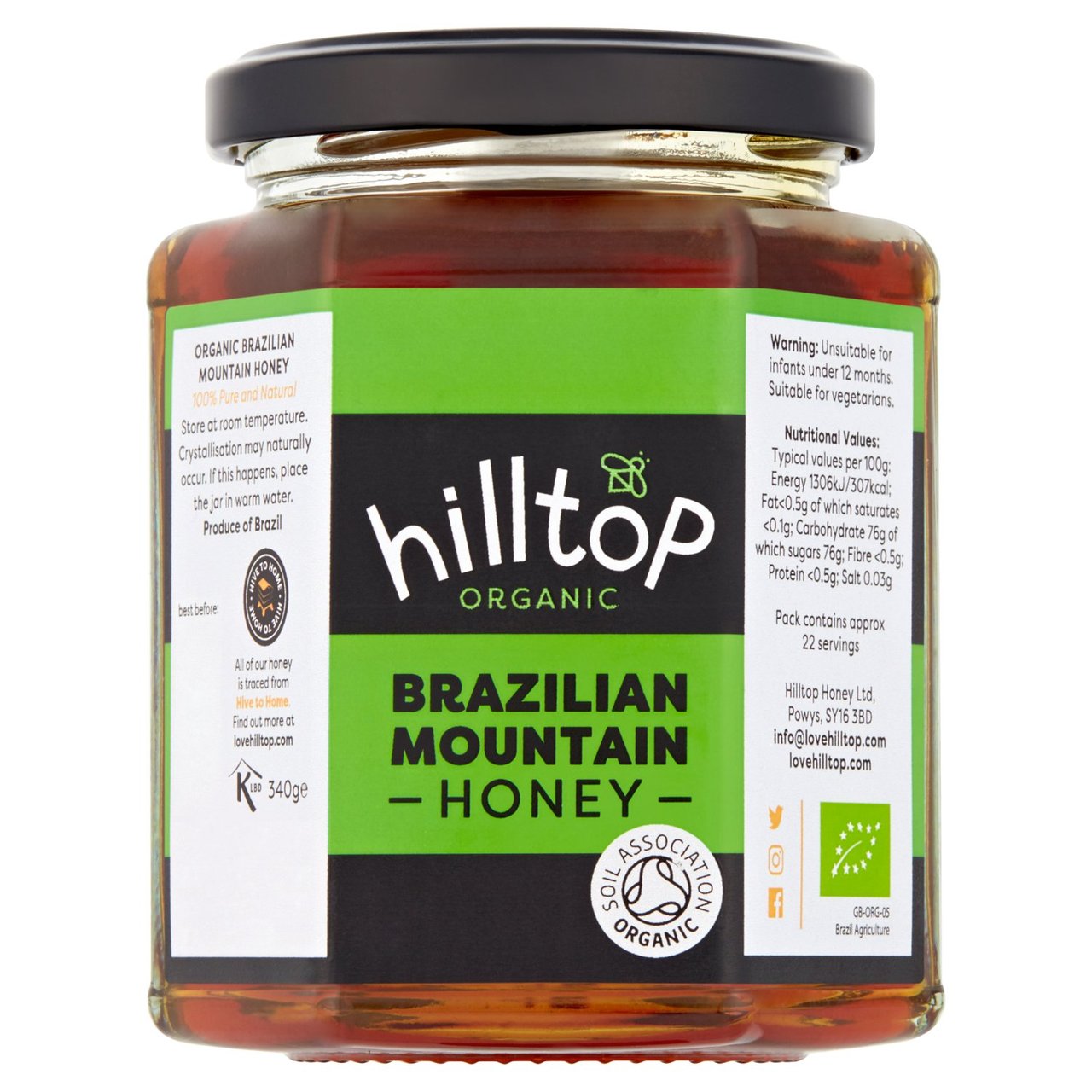 Hilltop Honey Organic Brazilian Mountain Honey is foraged by bees from a mixture of wild blooms, sourced from beekeepers, across the mountainous terrain of Brazil. Hilltop Honey Organic Brazilian Mountain Honey is 100% pure and natural - delectably dark amber in colour, floral and aromatic in flavour. Hilltop Honey Organic Brazilian Mountain Honey is a produce of organic agriculture and certified by the Soil Association. Available in a 340g jar. KLBD Approved. Honey may naturally crystallise.