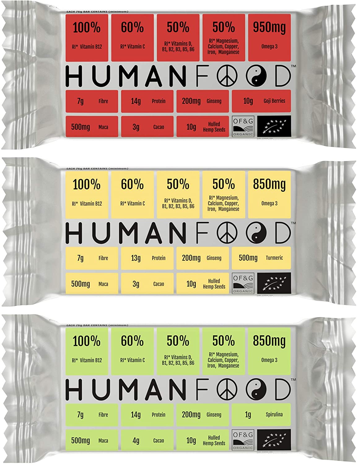 Human Food provides significant quantities of a wide range of nutrients which it can be difficult to obtain from plant-based diets, including 100% RI of vitamin B12, and 50% RI of Iron, Calcium, Vitamin D, Magnesium, Omega 3, vitamin B1, B2, B3, B5 and B6. Our protein bars provide all these nutrients in an organic, wholefood form, which is both more bioavailable and more effective than synthetic alternatives which, although they carry the same label, are rarely, if ever, structurally and chemically identical to the substances they claim to replicate, as they are found occurring naturally within food. Human Food also contains a range of functional ingredients which have proven benefits for long-term health and well-being.