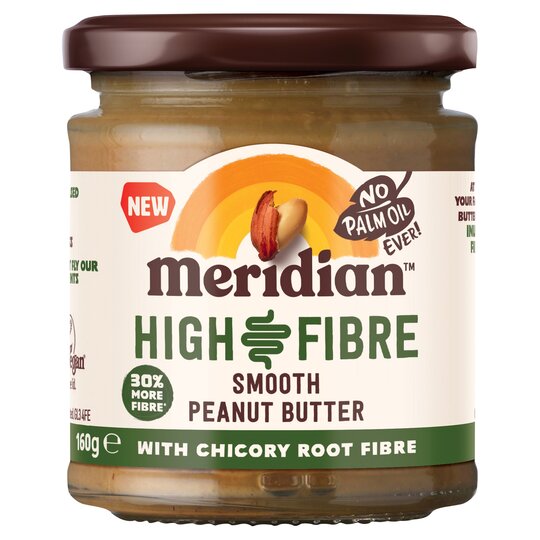 Meridian Foods have boosted your favourite smooth peanut butter with chicory root inulin adding 30% more fibre than the standard peanut butter. This prebiotic fibre supports gut wellness. Deliciously good on porridge or straight from the jar. Why not try High Fibre Breakfast Oats recipe for the perfect start to the day.