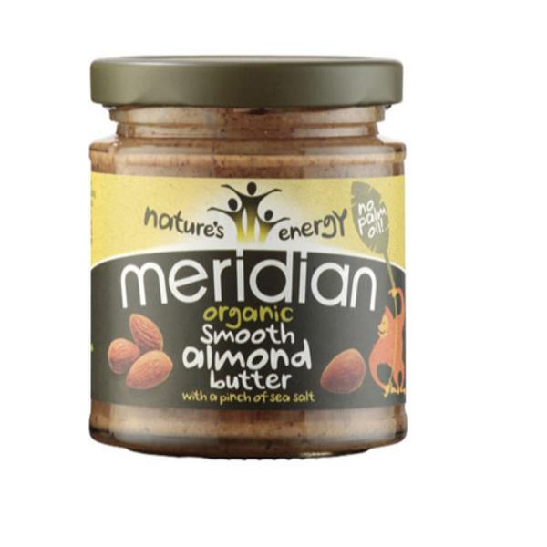 Meridian Organic Smooth Almond Butter with Salt is smooth almond butter, made using 100 percent almonds with a pinch of sea salt. Each almond contains around 20 percent protein and is low in saturated fat. Organic almonds are roasted in their natural brown skins before being ground to a smooth texture. Can try on crackers and crumpets, add to shakes, cakes and bakes.