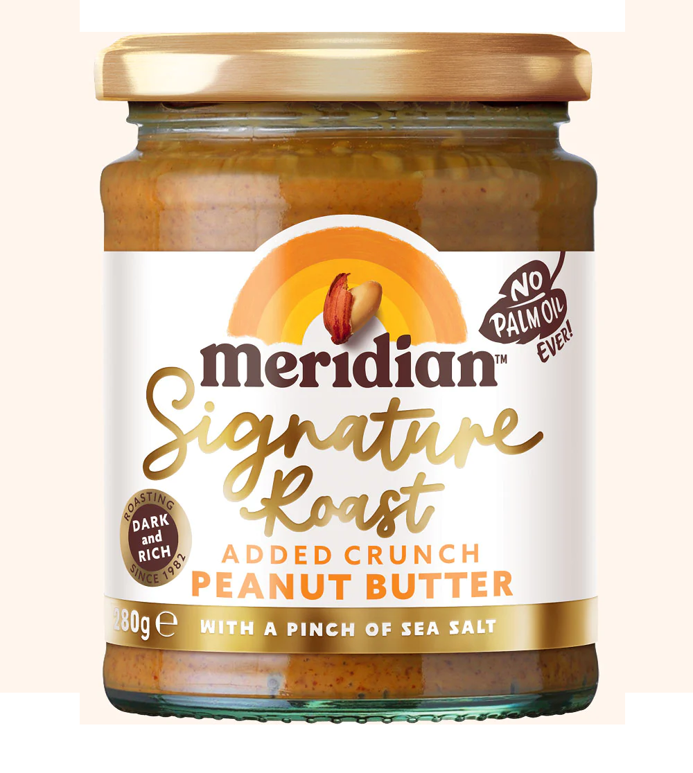 Meridian Signature Roast Crunchy Peanut Butter 280g is meridian, they believe nature produces the best & tastiest ingredients. Signature Roast is dark and creamy with a deliciously rich flavour. Their experts slowly roast peanuts in their natural skins and finely mill for a silky smooth texture. Then finish with a pinch of Cornish Sea Salt Flakes and crunchy peanut nibs for added crunch.