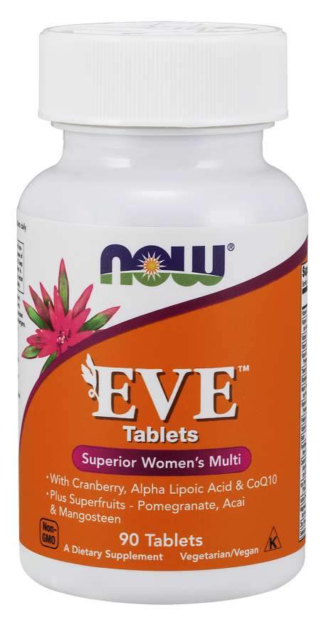 NOW EVE™ Tablets are specially formulated for the vitamin needs of adult women, featuring cranberry, alpha lipoic acid, CoQ10, superfruits, and more. This unique formula has 100% of the recommended daily value of iron, using Ferrochel™, a non-constipating form of iron.