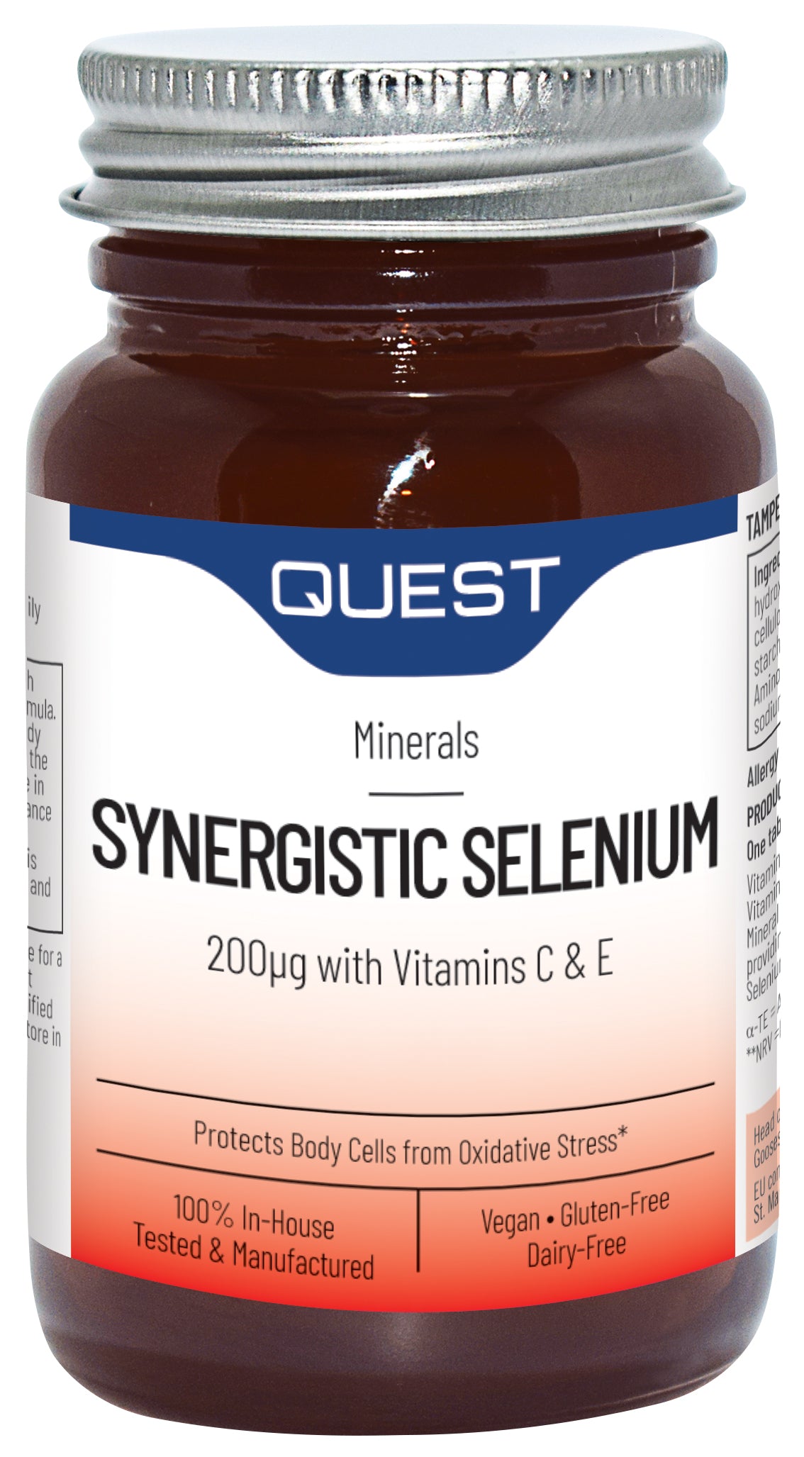 Quest Synergistic Selenium provides 200mcg of Selenium and includes Vitamin C and Vitamin E. Selenium is an essential mineral; it has a vital antioxidant role and is involved in the health of the prostate, the thyroid and the immune system.