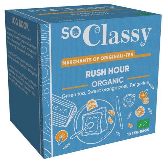 Discovered by So Classy's aficionados in their excursions around the globe, this Rush Hour tea is a rare delicacy. The end to bitter tea in the morning. Step towards sweetness. The green tea leaves are accompanied by orange peel and a slight scent of tangerine.