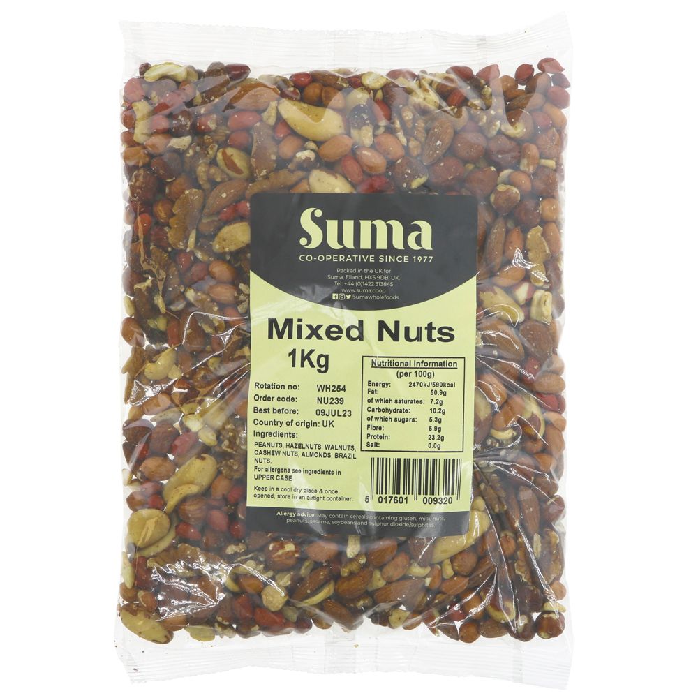Suma Bagged Down Mixed Nuts 1kg is a blend of almonds, cashews, hazelnuts, peanuts, and pistachios. It is a good source of protein, fiber, and healthy fats. It is also a good source of vitamins and minerals, including potassium, magnesium, and vitamin E. Great as a snack or alternatively can be used for baking.