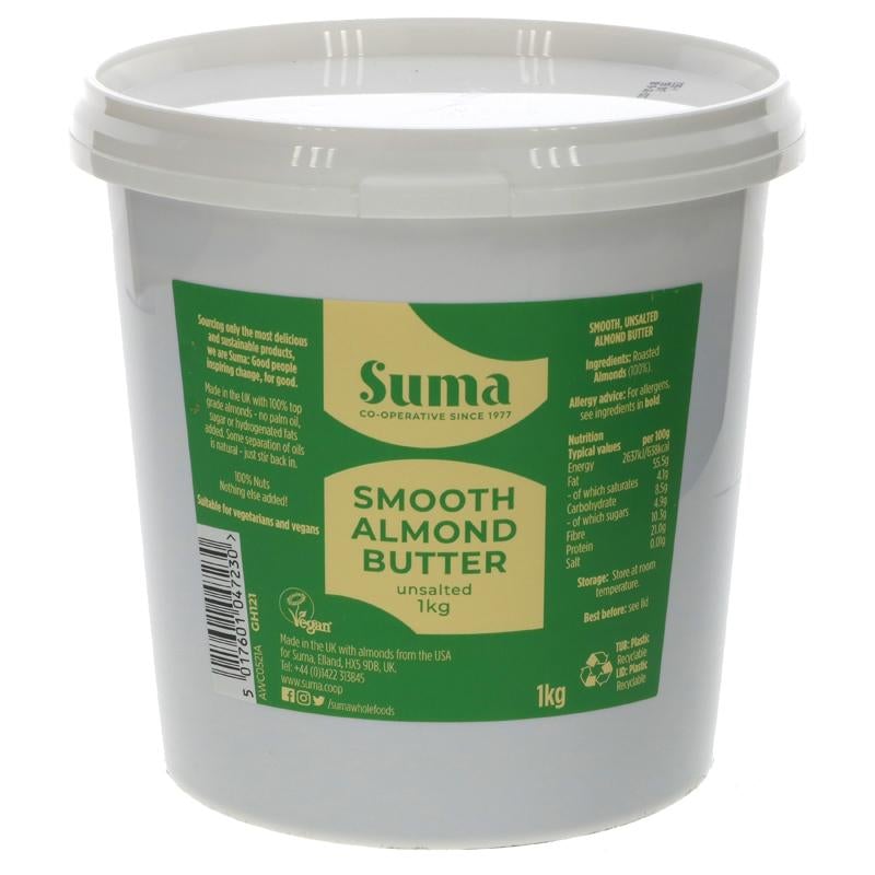 Suma 100% Almond Butter. Made in the UK. No palm oil, sugar or hydrogenated fats added - just top grade, quality, almonds. Some separation of oils is natural - just stir back in