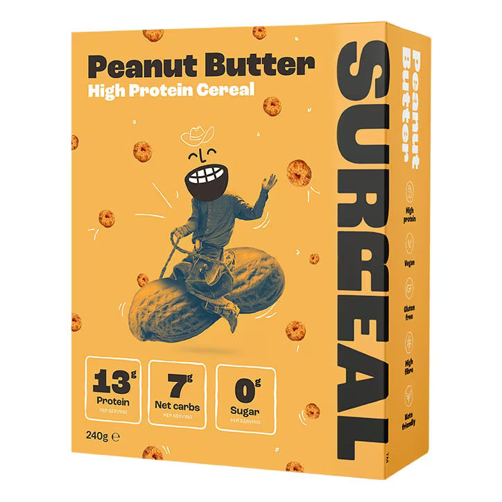 Surreal’s high protein cereal tastes just like your childhood faves - with none of the junk. High protein - 13g per bowl, Zero sugar per serving - and still super tasty. Vegan and gluten free. Surreal have taken the cereals you loved as a kid and given them grown up reboots. Their Peanut Butter cereal has more protein than you can shake a spoon at - and zero sugar per serving. It’s the perfect breakfast (or midnight snack) for your inner child.