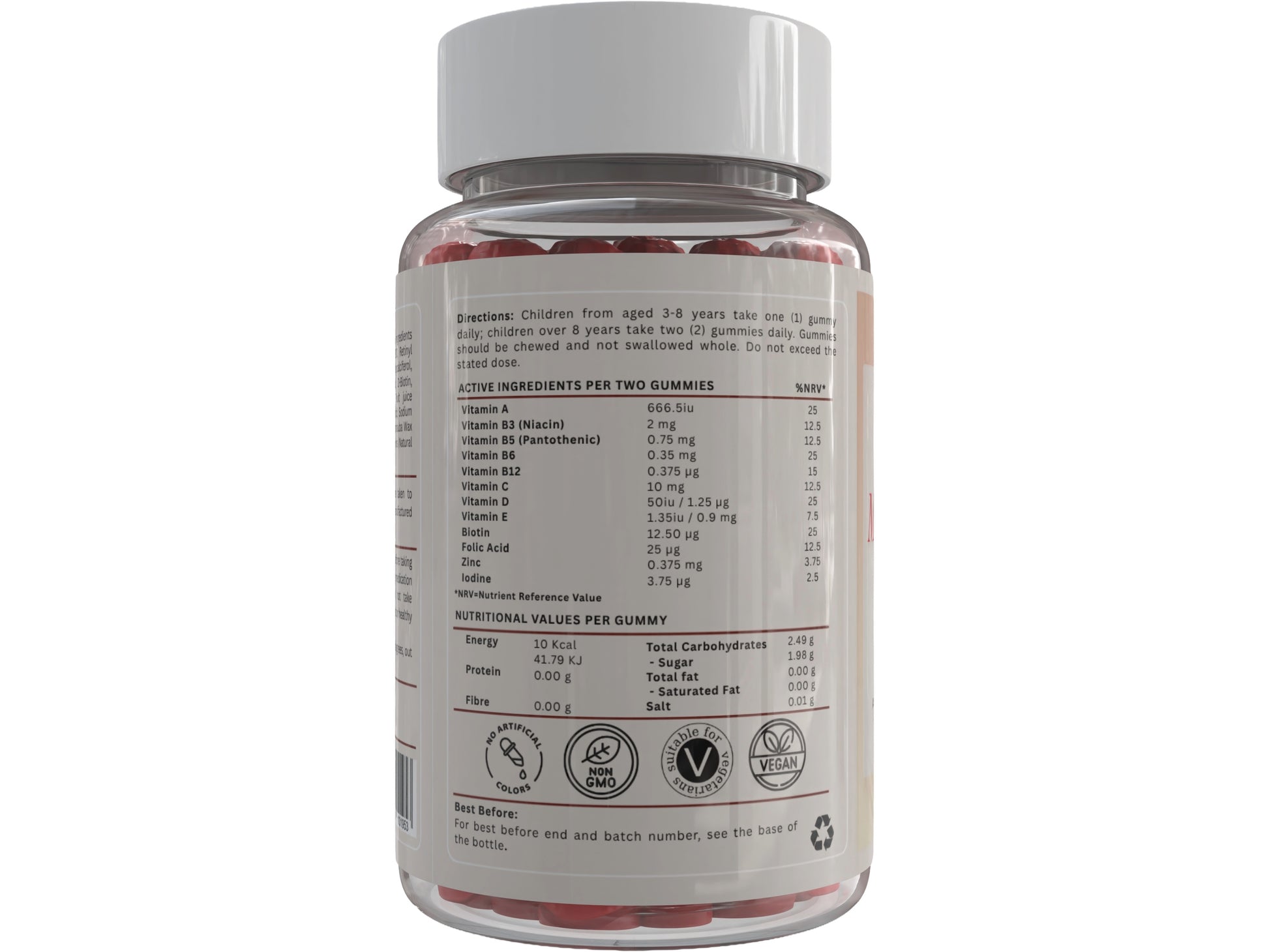 - Complete Daily Support for Kids – Each gummy provides a balanced blend of essential vitamins and minerals including A, B3, B5, B6, B12, C, D2, E, Biotin, Folic Acid and Zinc to support everyday wellbeing.