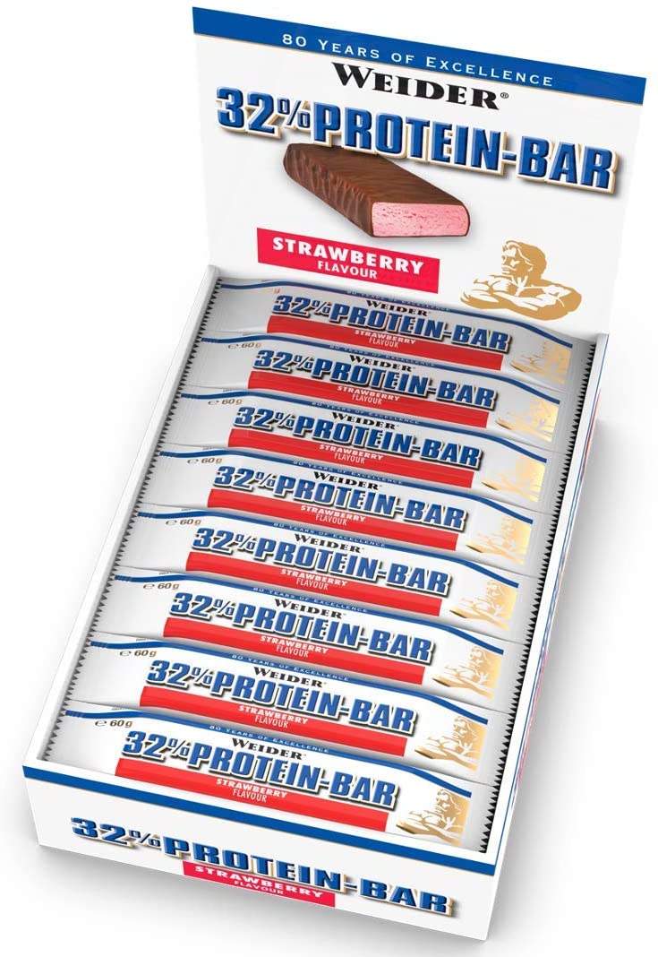 The Weider 32% protein bar stands out through its high protein and low fat content. It offers a well-balanced and protein-rich diet with a great taste. The Weider 32% protein bar corresponds with the athletic guideline of nutrition and gives you the possibility of an easy and well-balanced diet.The difference to ordinary chocolate bars, is not just the high content of high-quality proteins, but also the low fat content of just 5.4g per 60g bar. Furthermore, the Weider 32% protein bar covers a large part of the daily vitamin requirement. Covered in a thin layer of milk chocolate, It is the ideal snack for bodybuilders.