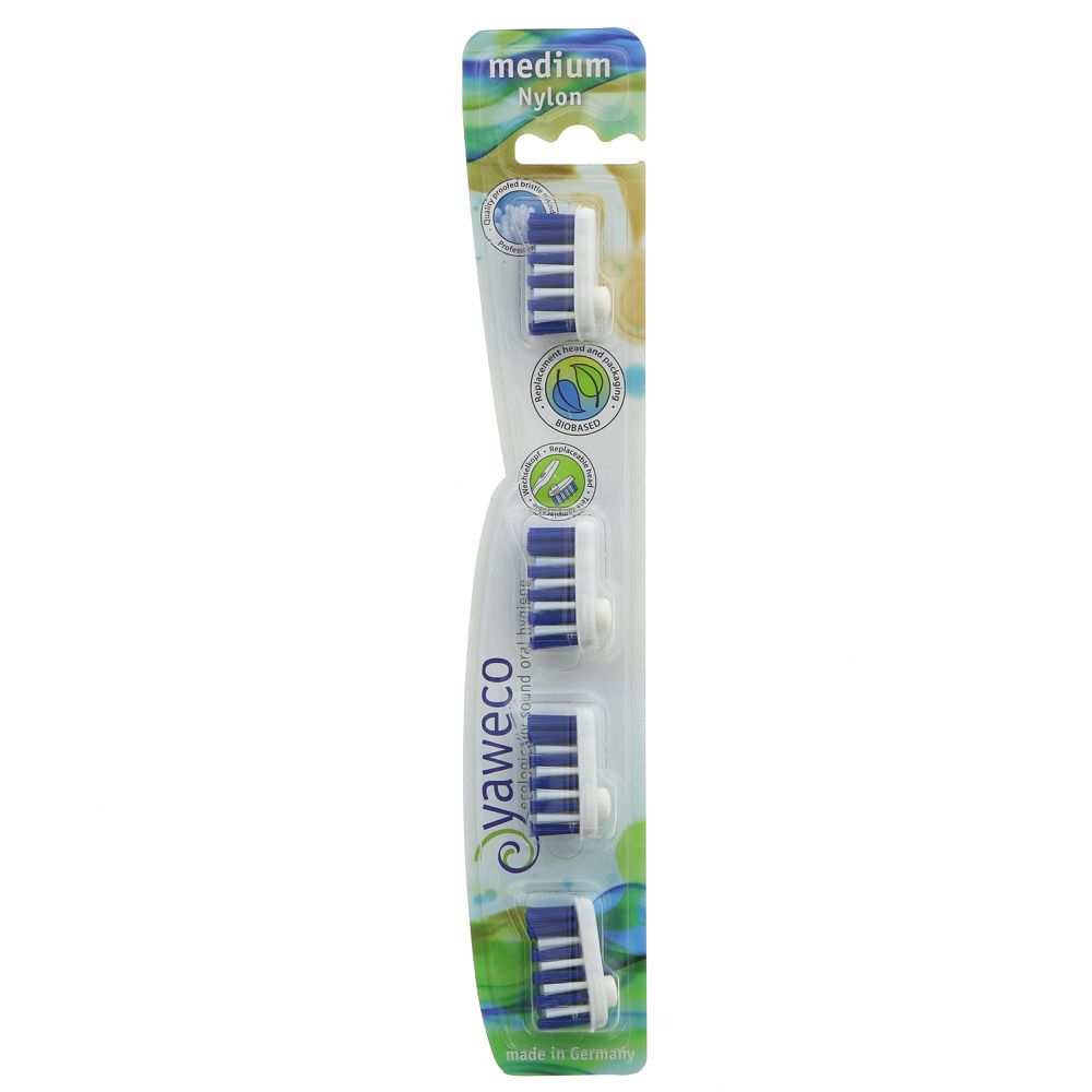 Yaweco Replaceable Toothbrush Heads made of nylon with medium rounded bristles and low and high bristle groups to effectively clean the back teeth. Yaweco Toothbrush head will clip onto your Yaweco toothbrush. Remember to replace the toothbrush head every 3 months. There are 4 toothbrush heads in every pack.